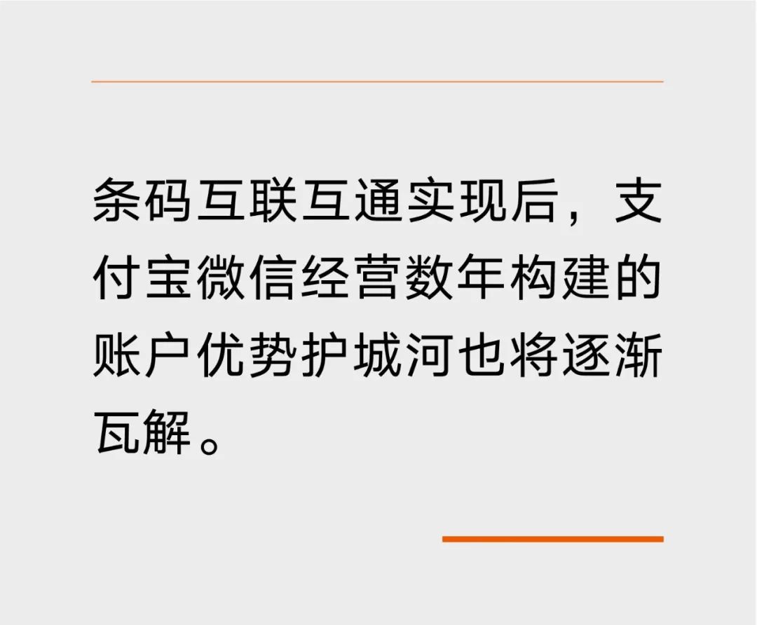 上述《规划》同时提出:构建条码支付互联互通技术体系,打通条码支付服务壁垒,实现不同APP和商户条码标识互认互扫。这项规定无疑成了巨头推动刷脸支付的加速剂,条码互联互通实现后,支付宝微信经营数年构建的账户优势护城河也将逐渐瓦解。