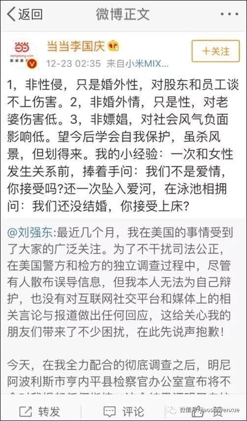 2018年12月23日,李国庆转发刘强东的致歉,并说了三点: