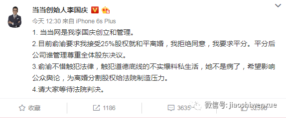 随后,李国庆开始频繁接受各大媒体的采访,频繁露出,并且发布了诸多对和俞瑜的关系、当当的控制权等细节描述。