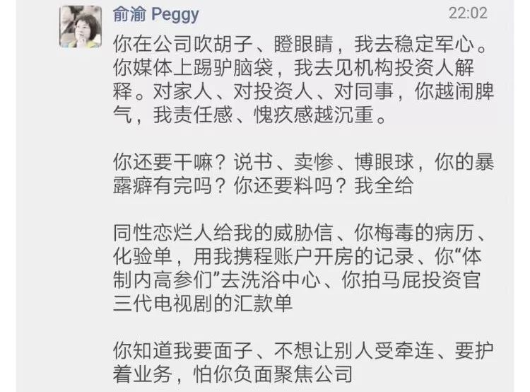 最后,俞渝还要接受李国庆的同x恋人的威胁信,包括梅d病例、化验单?