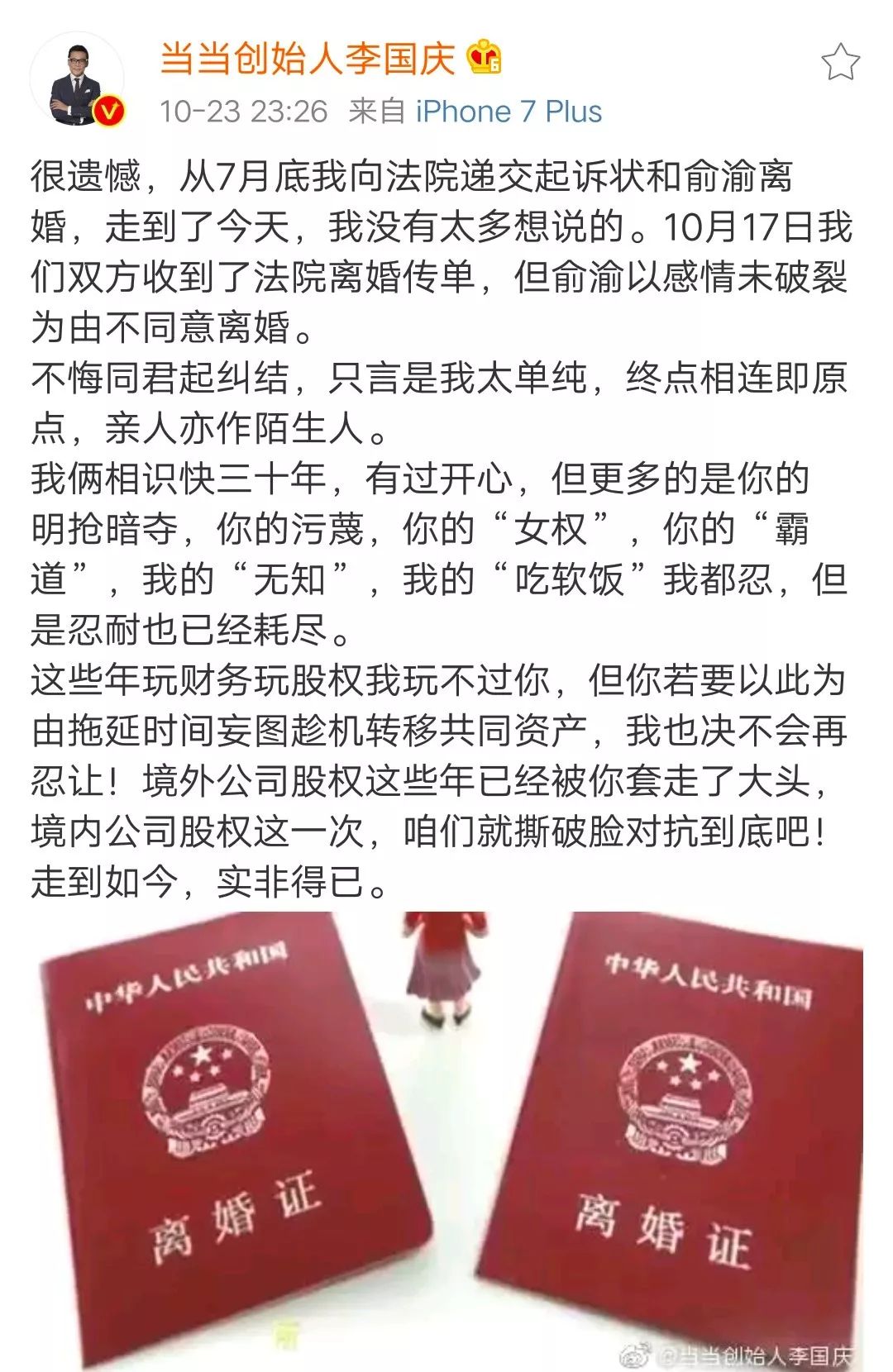 10月24日零点42分,俞渝在朋友圈发布十二字:“家门不幸,顾客无碍,当当更好。”