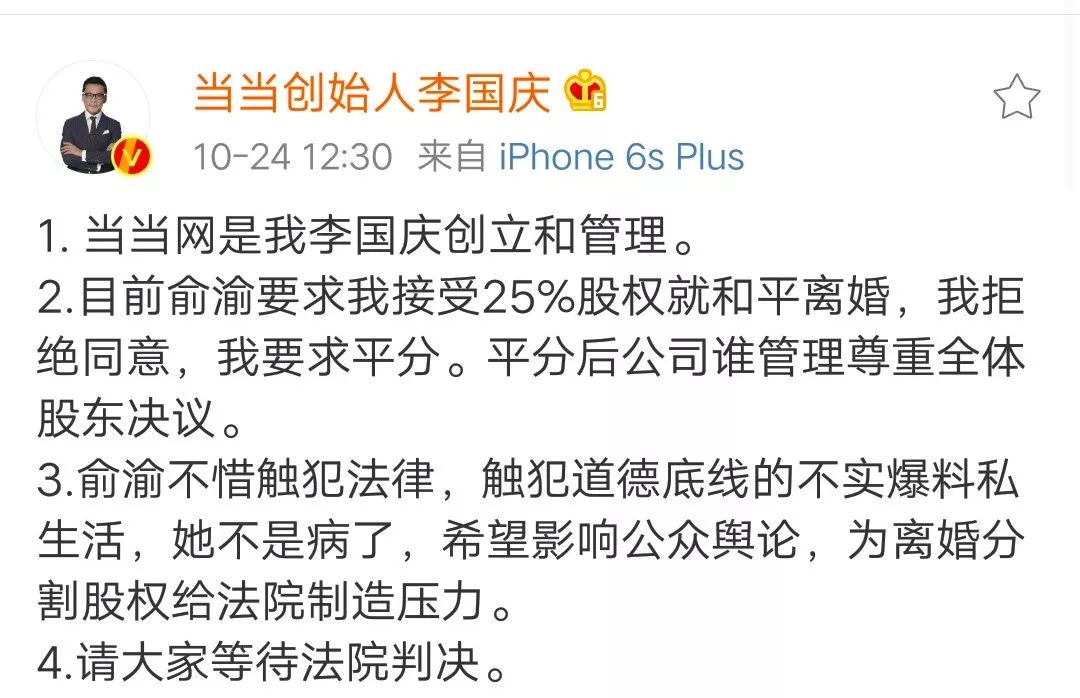 今天事情也有新进展,李国庆今日中午再度回应称,目前俞渝要求其接受25%股权就和平离婚,“我拒绝同意,我要求平分。平分后公司谁管理尊重全体股东决议”。