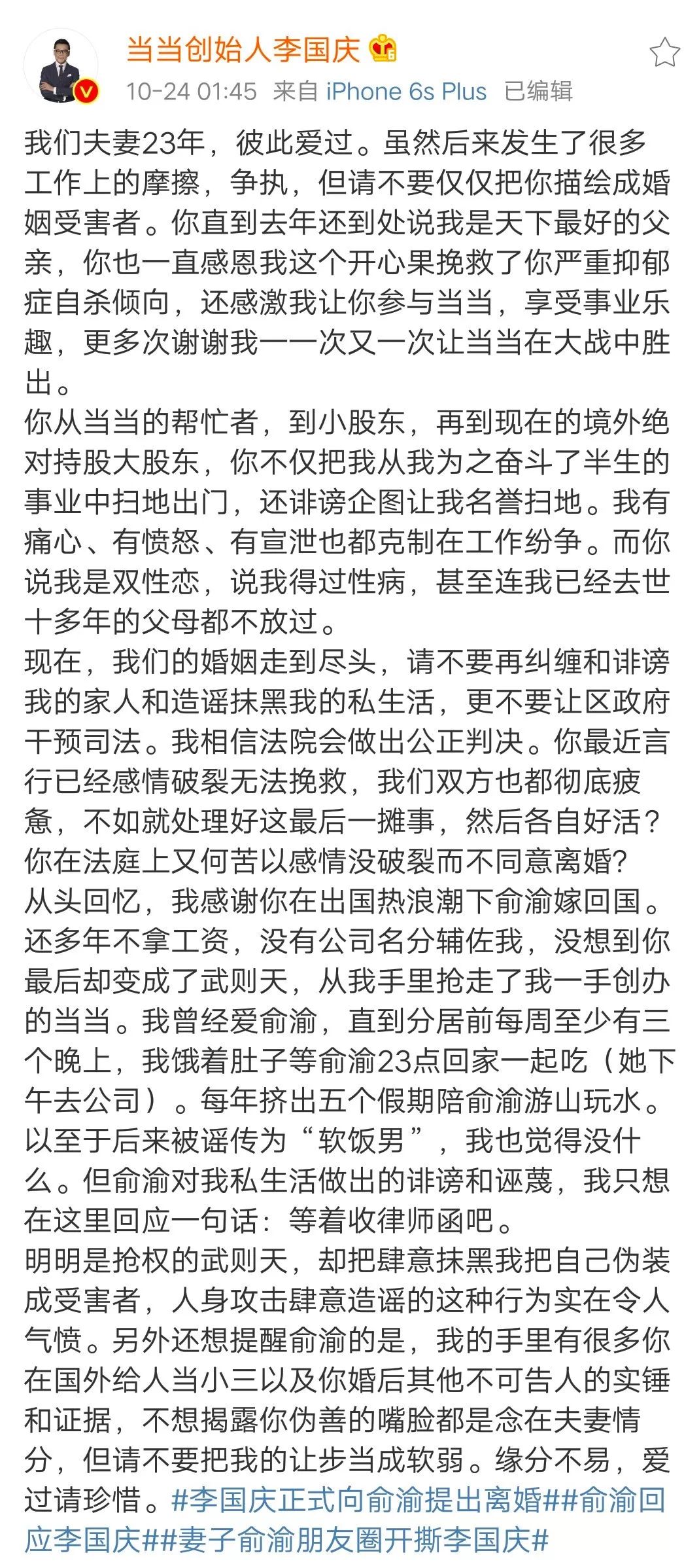 李国庆在1点45分,李国庆又发微博,让俞渝等着收律师函。全程否认俞渝说的事情,又指出俞渝自己在国外给人当小三?婚后还有不可告人的事情?