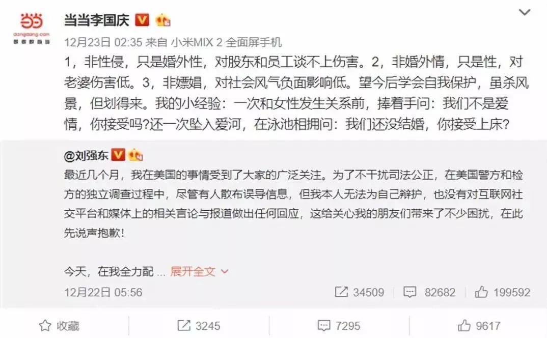 2018年12月下旬,刘强东性侵案在美国免于被起诉,李国庆转发了他的微博,留言表示: