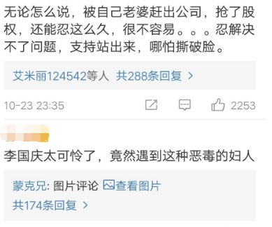 此篇微博发出后,不少网友闻声赶来,热评几乎一致的同情李国庆的遭遇,认为李国庆太可怜,被自己老婆赶出公司,抢了股权,附合李国庆的想法说他的妻子是恶毒、唯利是图的妇人,而李总代表天真、真诚、君子、敞亮的豁达君子!