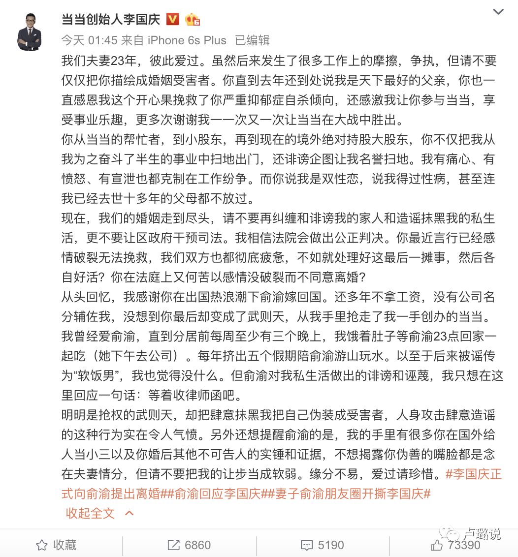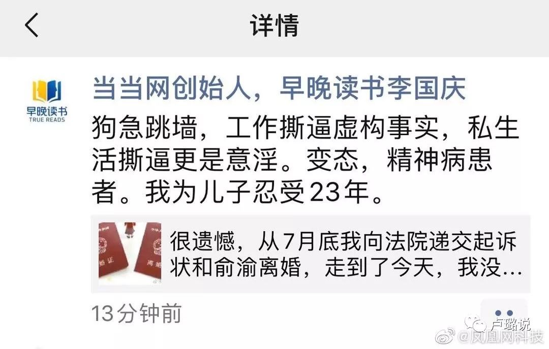 几个小时候后,也就是24号1:45,李国庆再次在微博发长文反驳俞渝,继续增加信息量,说俞渝在国外给人当小三,让俞渝等他的律师函。