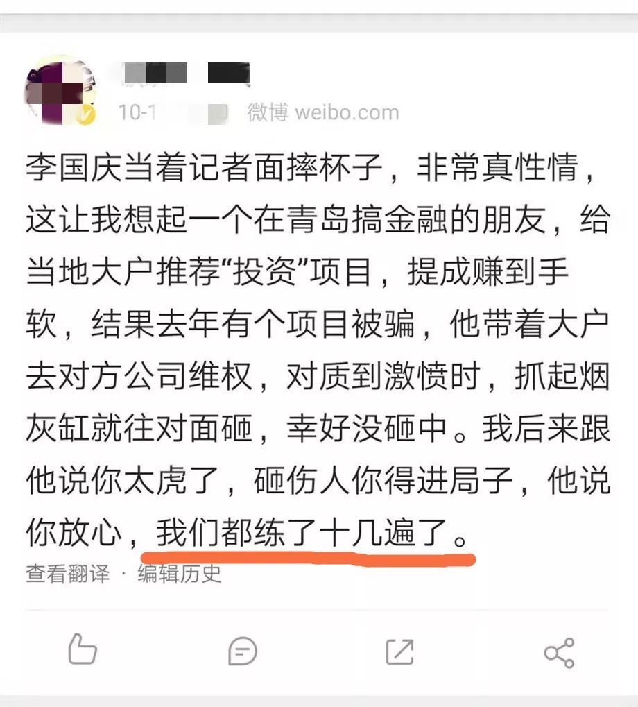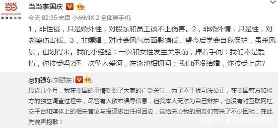 值得一提的是,在2018年的刘强东事件中,李国庆发微博力挺刘强东:非性侵,只是婚外性,对股东和员工谈不上伤害。微博中,他把婚外情分成三六九等,甚至于把自己的婚前行为拿来所谓“分享”。