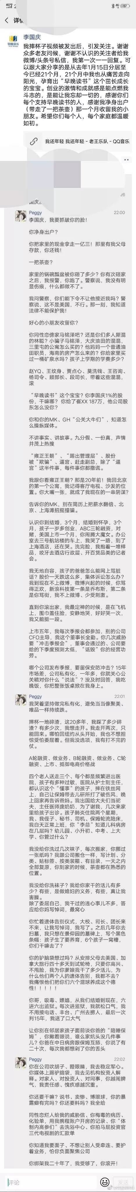 朋友圈的截图显示,昨日即23日晚上,俞渝突然在李国庆19日转发的一条朋友圈下长文留言,称李国庆拿走一亿三,并非净身出户,并爆出李国庆诸多私生活猛料,并放话:“李国庆,我要抓破你的脸。”