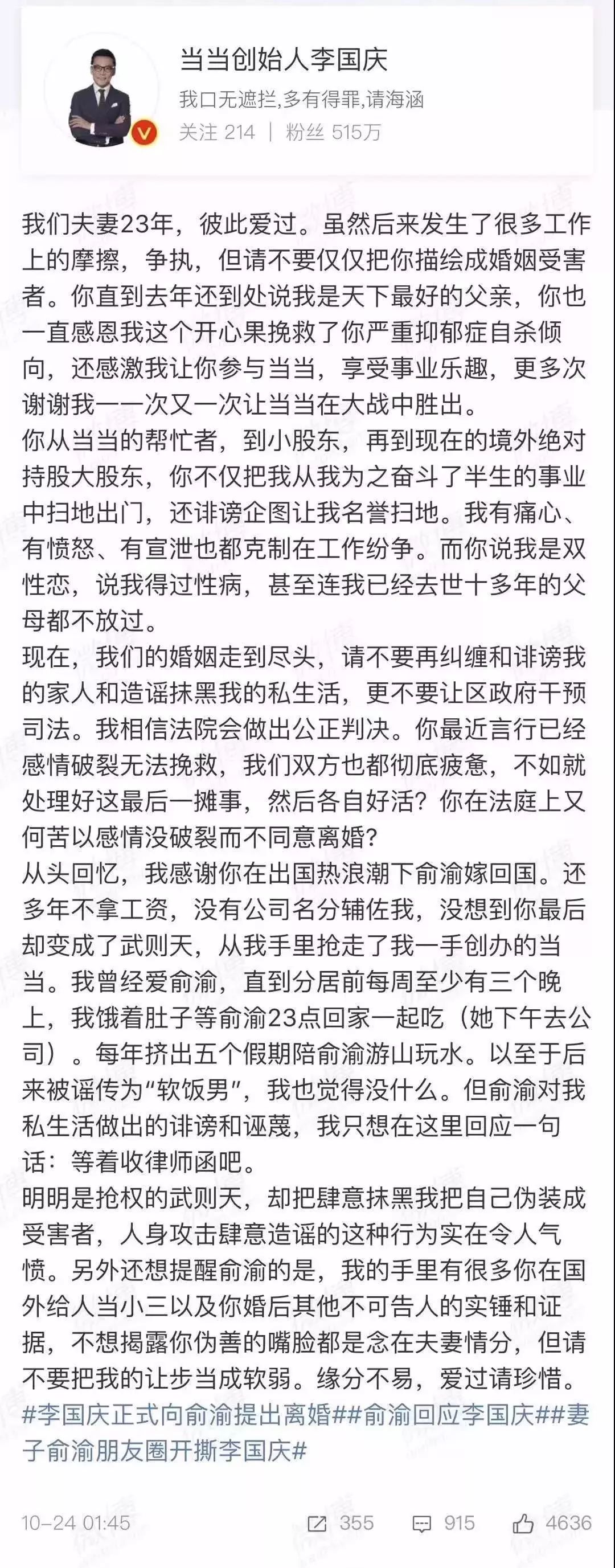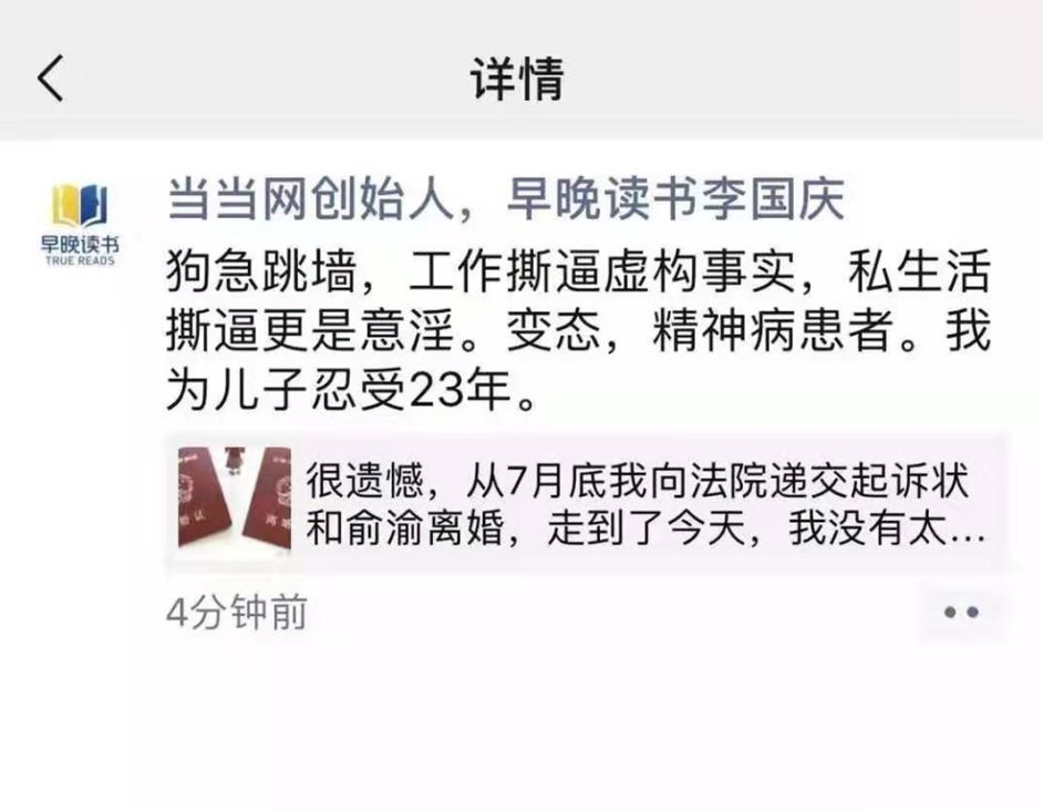 稍早前的23日晚23:26,李国庆则转发自己7月底递交起诉状和俞渝离婚的微博,并表示,“狗急跳墙,工作撕逼虚构事实,私生活撕逼更是意淫。变态,精神病患者。我为儿子忍受23年。”