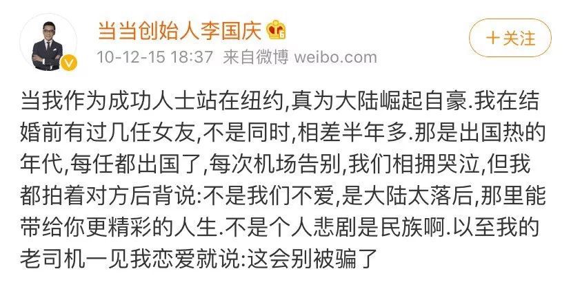 2010年,当当上市后,李国庆发了一篇语无伦次、政治很不正确的微博。