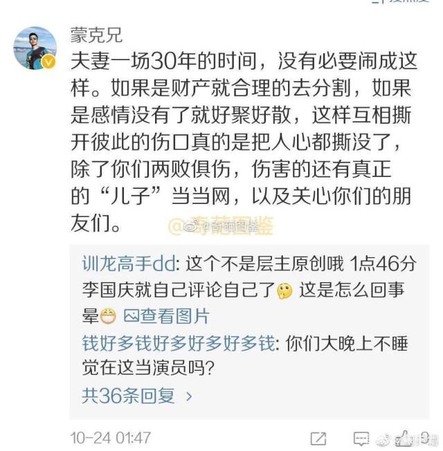 有网友爆出截图,李国庆装路人评论这条微博,就是......手有点滑,忘换小号了。