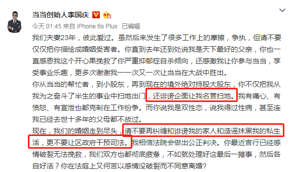 李国庆也不是软柿子,立刻发文,说要“对抗到底”,文中指出两点: