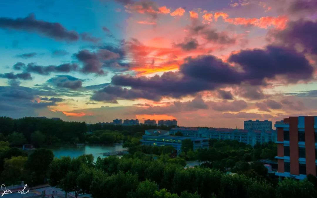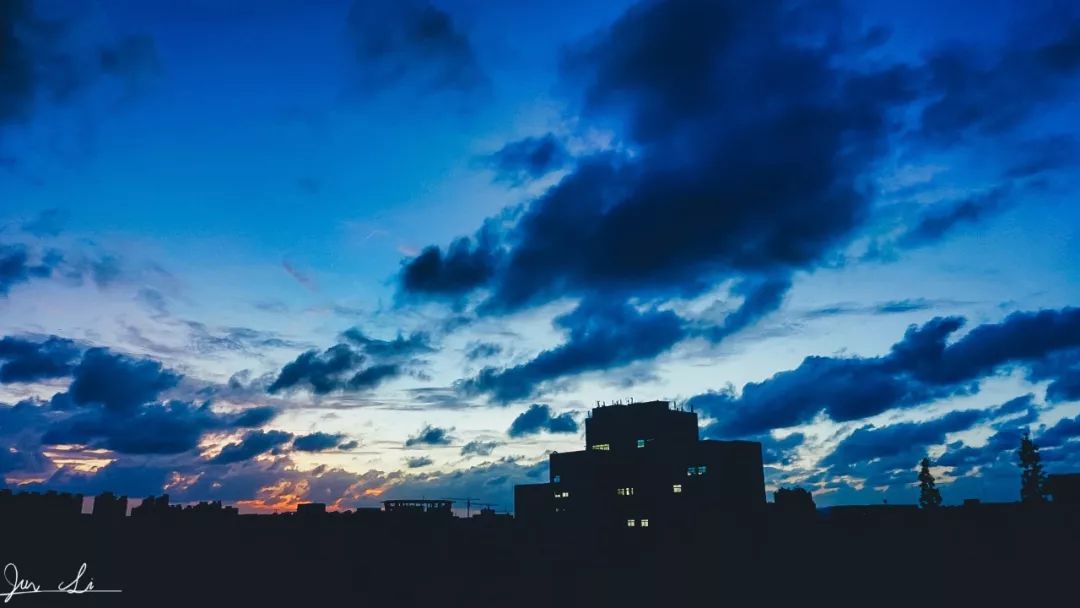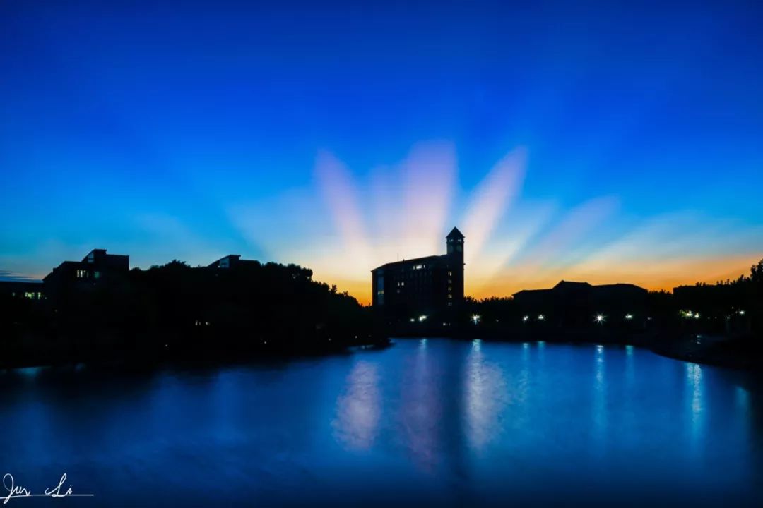 夕阳西下,钴蓝色plus橘黄色的绝美晚霞,物理楼“凸”显其中。