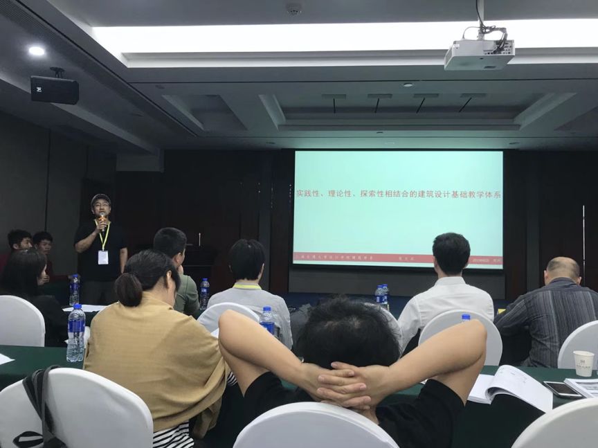 范文兵教授的报告题目为《实践性、理论性、探索性相结合的建筑设计基础教学体系》。报告从上海交大建筑学系的发展历史和教育改革背景出发,详细介绍了以二年级为主干的建筑设计基础教学体系的理论与现实依据,解析了体系组成的“形态”、“空间”、“建构”、“基地”四个板块,从实践性、理论性、探索性三个角度,展示了基础教学体系的特色与水平。