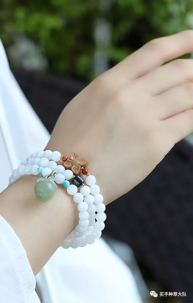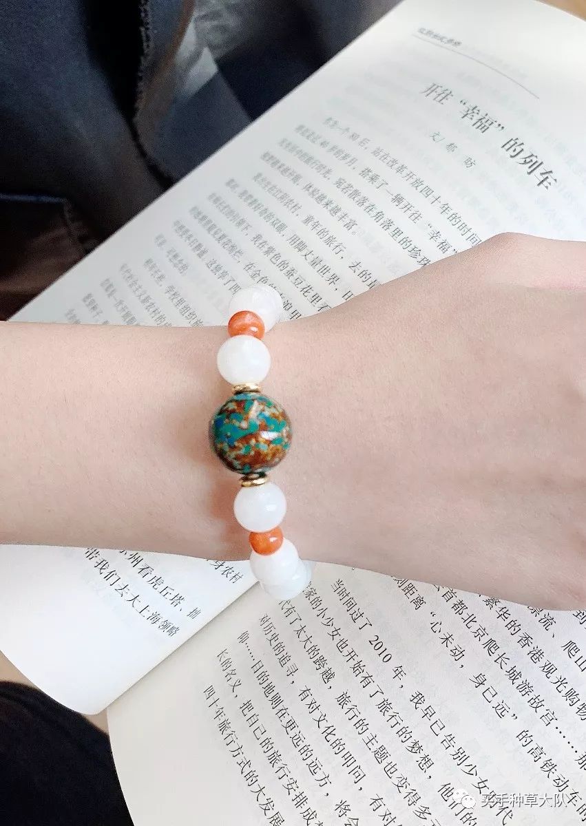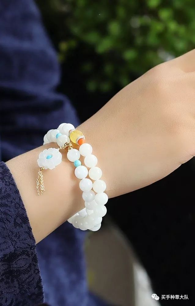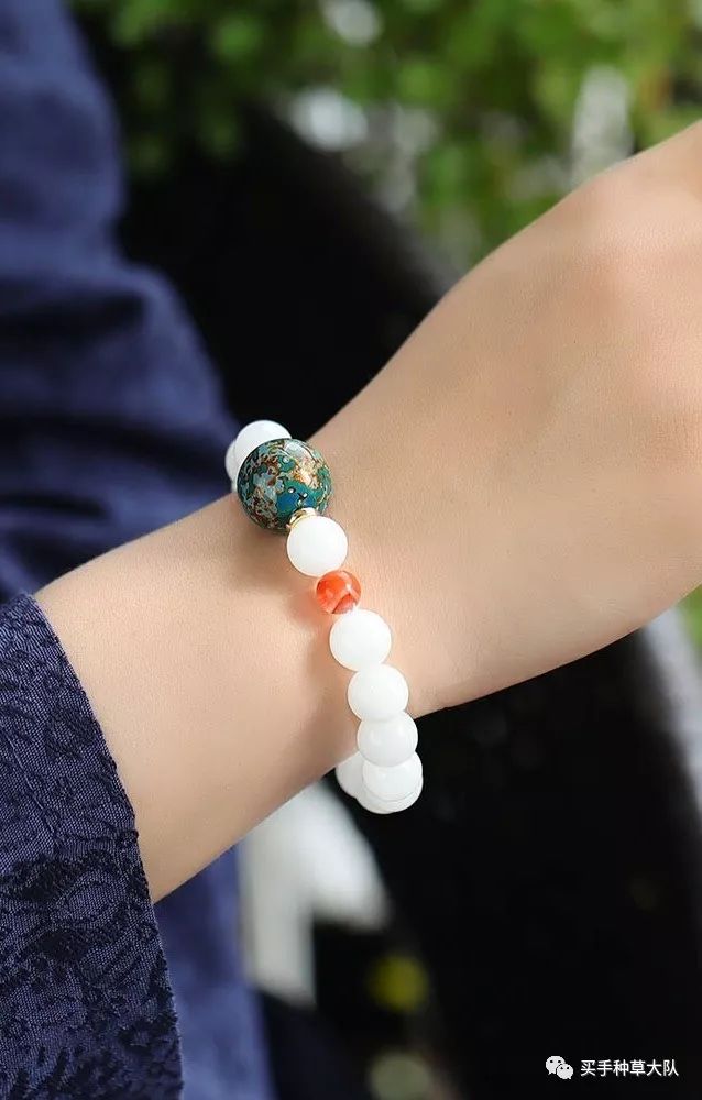 精致,文艺范十足,和田玉和五彩矿石撞色,戴着略带些异域风情。