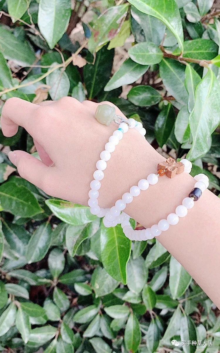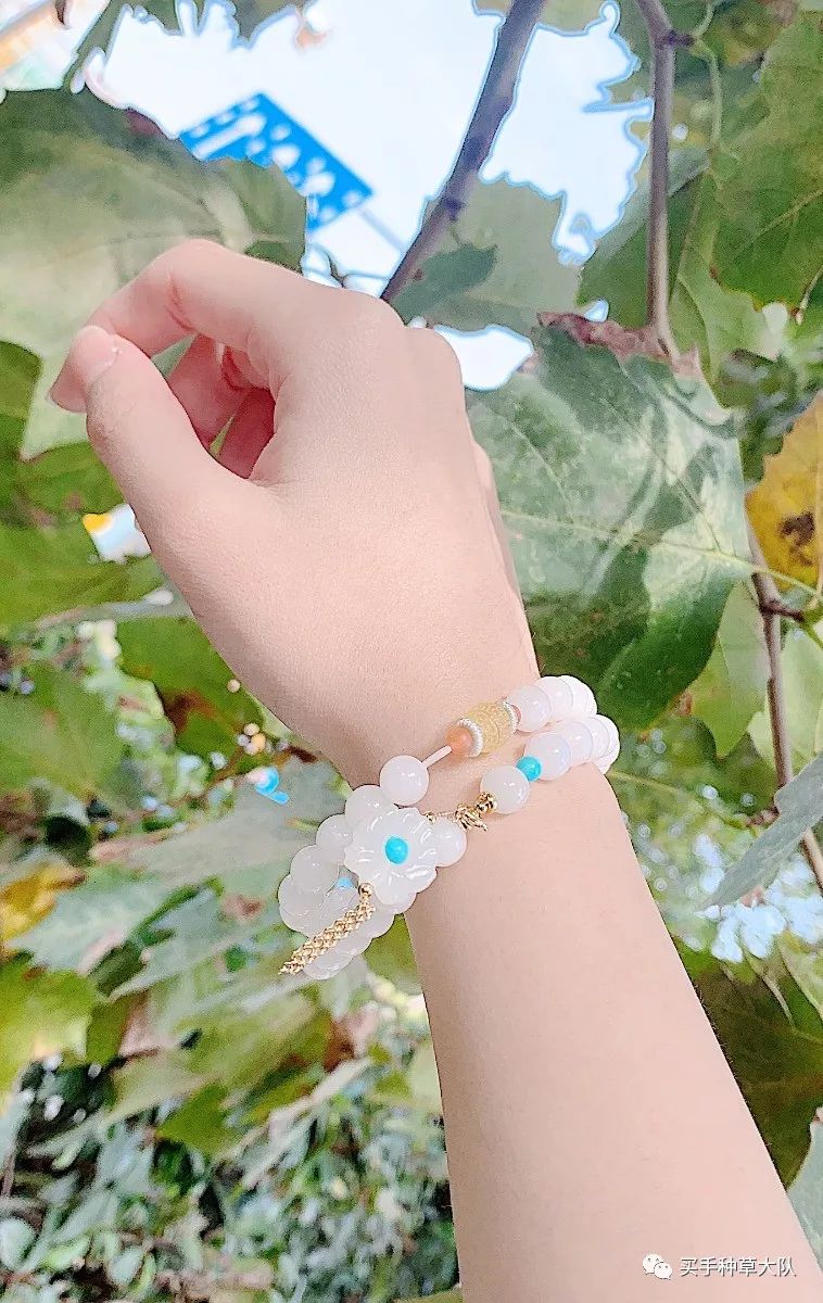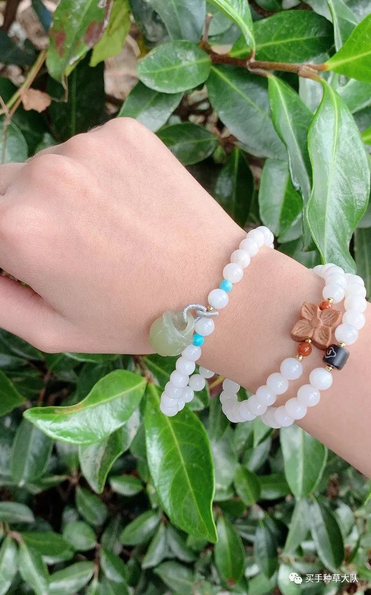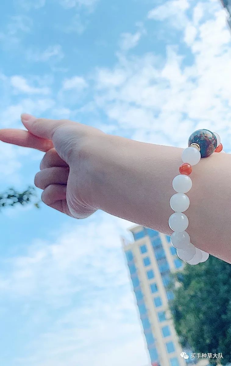 精致,文艺范十足,和田玉和五彩矿石撞色,戴着略带些异域风情。
