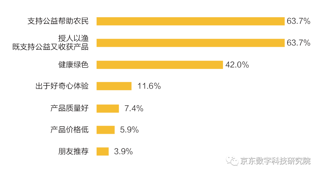 96%的消费者因为众筹扶贫产品可以支持公益,而提升了购买意愿;另外,在影响消费者购买决策的因素中,支持公益帮助农民的因素和既支持公益又收获产品的因素都占到了63.7%,可以看出众筹方式的互惠共赢起到了重要推动作用。