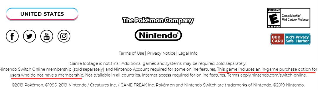 上周末有玩家发现美国任天堂《宝可梦剑/盾》相关网页中出现了有别于其他国家地区、以及其他游戏的一段描述“某些在线功能需要任天堂会员(单独出售)和任天堂帐户。该游戏包含一个内购选项,供没有会员资格的用户使用。并非在所有国家/地区都可用。”。