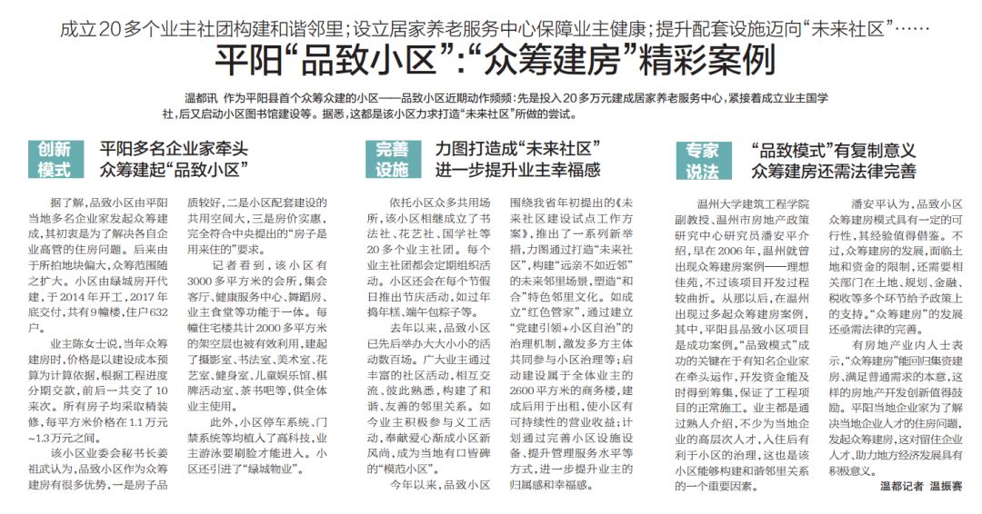 有房地产业内人士表示,“众筹建房”能回归集资建房、满足普通需求的本意,这样的房地产开发创新值得鼓励。平阳当地企业家为了解决当地企业人才的住房问题,发起众筹建房,这对留住企业人才、助力地方经济发展具有积极意义。品致小区众筹成功,如今业主安居乐业,邻里关系和谐,无疑为行业树立了众筹建房模式的“品致样本”。