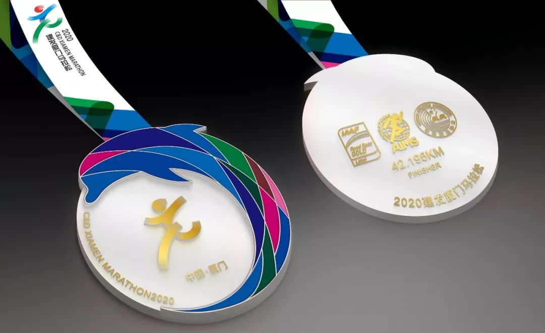 2020厦门马拉松延续“跑步爱上一座城”赛事主题,视觉体系进一步延伸应用,打造完赛奖牌和参赛T恤。2020厦马的完赛奖牌以海豚身形突出设计曲线,一方面以和平使者海豚体现厦马以包容的心态迎接来自世界各地的跑者;另一方面,海豚被视为建立人与自然合作的使者,代表着厦马多年致力于环境保护为跑赋能的决心。而奖牌中间强化厦马logo的跑者形象,强调永不止步、积极进取的马拉松精神。