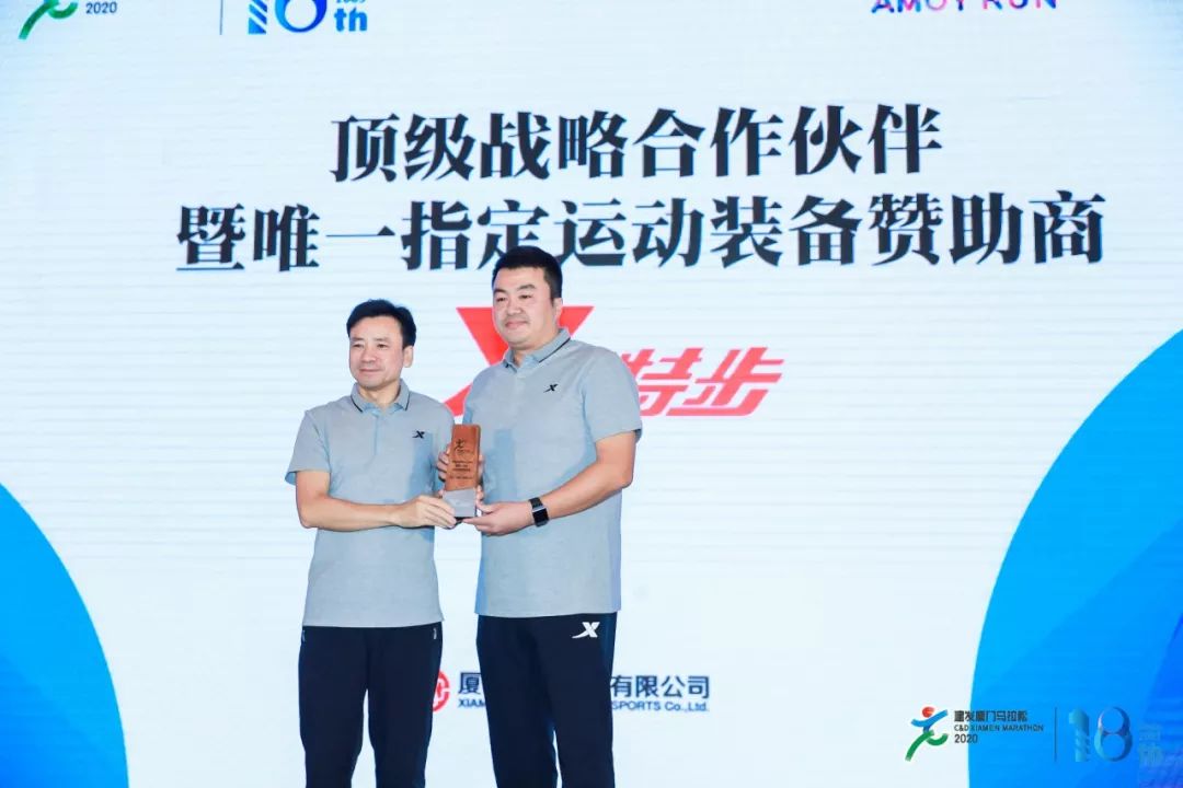 ▲厦门市体育局局长阮敦梁(左)为赛事顶级战略合作伙伴特步(中国)有限公司授牌2003年厦门马拉松创办,全国的马拉松赛事只有5场。经过多年的发展,马拉松成为中国体育产业的新蓝海。作为中国第一个市场化运营的大型马拉松赛事,历经17年的岁月洗礼,已经成长为国内领先的马拉松赛事,获得国际田径联合会(IAAF)、国际路跑协会(AIMS)、中国田径协会(CAA)三大权威顶级认证赛事,入选“国家体育产业示范项目”,获评首批“国家体育旅游精品赛事”,并连续12年荣获国际田联颁发的“国际田联路跑金标赛事”,2019年获评国际路跑协会“绿色马拉松”称号,迄今为止仍保持中国境内马拉松男子最好成绩。厦门也因为厦马演化成为马拉松城市。