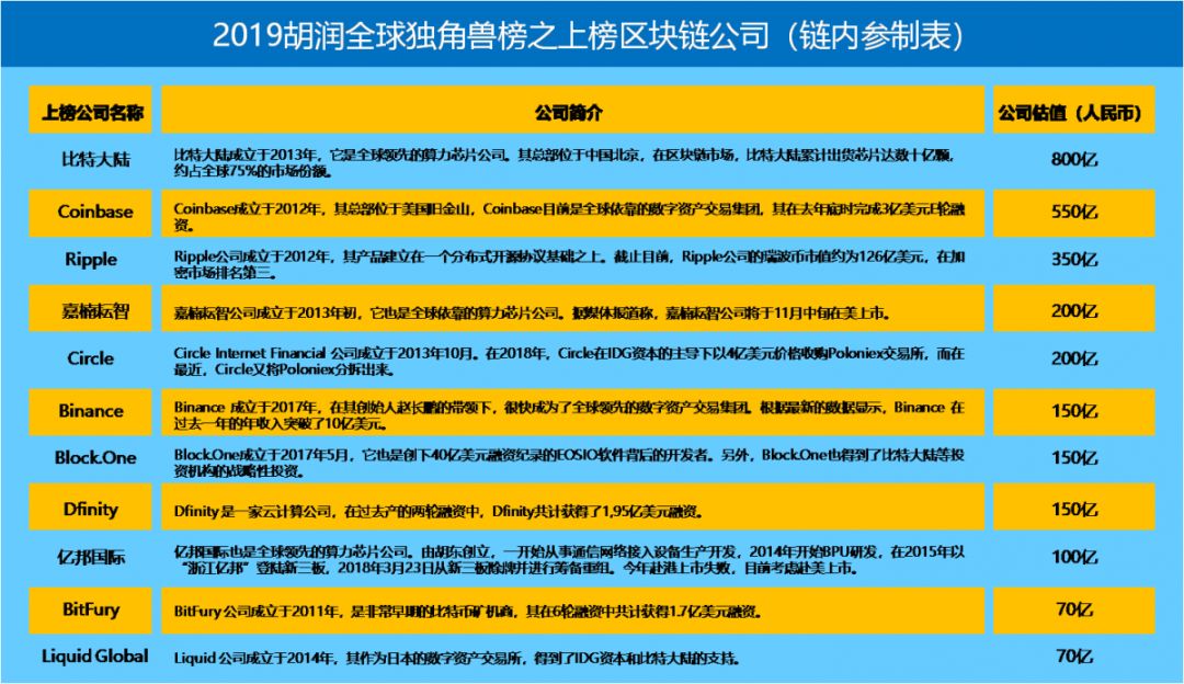 它们分别为比特大陆(估值为800亿人民币)、Coinbase(估值为550亿人民币)、Ripple(估值为350亿人民币)、嘉楠耘智(估值为200亿人民币)、Circle Internet Financial(估值为200亿人民币)、Binance(估值为150亿人民币)、Block.One(估值为150亿人民币)、Dfinity(估值为150亿人民币)、亿邦国际(估值为100亿人民币)、BitFury(估值为70亿人民币)、Liquid Global(估值为70亿人民币)。