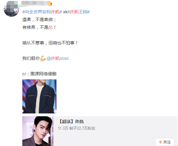 所以许凯性格“温柔”(song)是真的,会动手也是洗不掉的,不过现在其实很多人都忘了这一茬了,许凯走红之后难得一直很低调,现在风评口碑还不错,而他作为于妈手底下的爱将,公司很多好的资源和剧本会先让他挑,然后才会轮到公司的其他男演员,所以只要他不作妖,星途是一片光明。