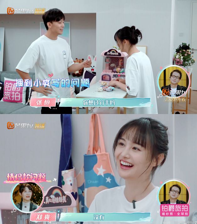 这两天分手传闻盛传,郑爽与张恒在节目上表现也是甜甜蜜蜜,玩真心话娃娃机时,郑爽问张恒上节目怕不怕分手,张恒回答:“不怕啊,我没想过分手”,郑爽怕张恒后悔相恋,也笑着说自己没想过分手,还暗自心疼总是遭受舆论压力的张恒,节目播出之后,还有张恒公司员工在某社交软件晒出他观看郑爽视频的照片,并配文“审片男”,也算是在侧面回应两人分手传闻了。