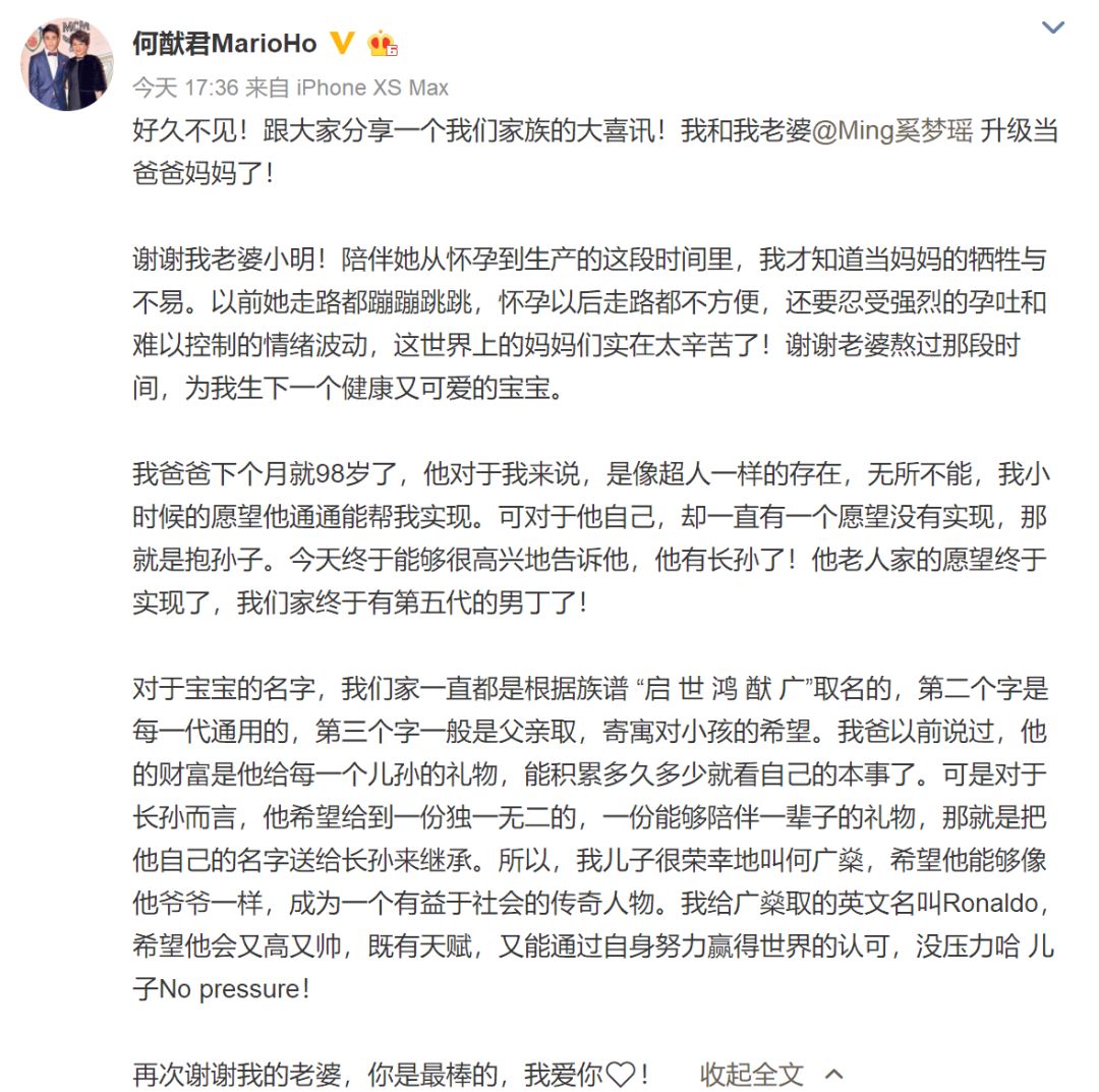 在何猷君公开的微博里,作为新手爸爸的他,激动地感谢了所有人,包括他98岁的老父亲。