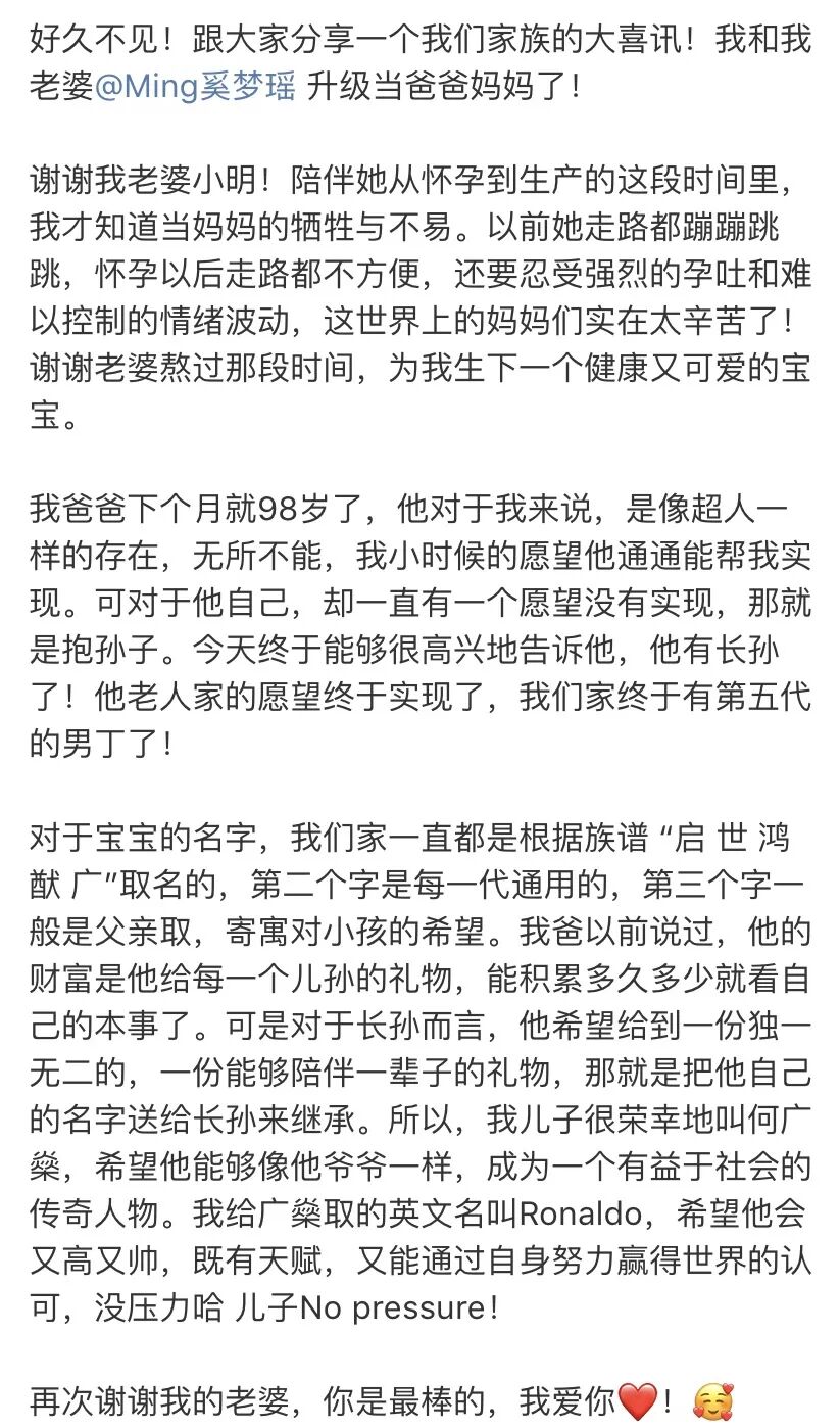 奚梦瑶生子,24日下午,@何猷君MarioHo 发文宣布@Ming奚梦瑶 生子喜讯,并公布了孩子的名字“何广燊”,英文名叫“Ronaldo”。随后奚梦瑶幸福地转发微博“亲爱的小王子,欢迎来到这个世界!??”照片中,奚梦瑶抱着孩子母爱满满,赌王四太一家全部出镜。何猷君兴奋写道:“我爸爸下个月就98岁了,今天终于能够很高兴地告诉他,他有长孙了!”据悉,奚梦瑶何猷君曾一起上过恋爱真人秀《爱的时差》,男方今年5月13日向女方求婚成功,7月4日,二人晒出结婚登记照正式宣布结婚喜讯。恭喜两位升级当爸妈~