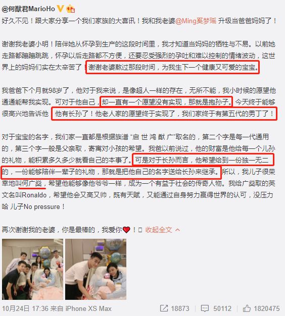 何猷君高兴坏了,在微博洋洋洒洒写下几百字,句句不离他的“男丁”“长孙”,就差直接说出能拿多少钱了。