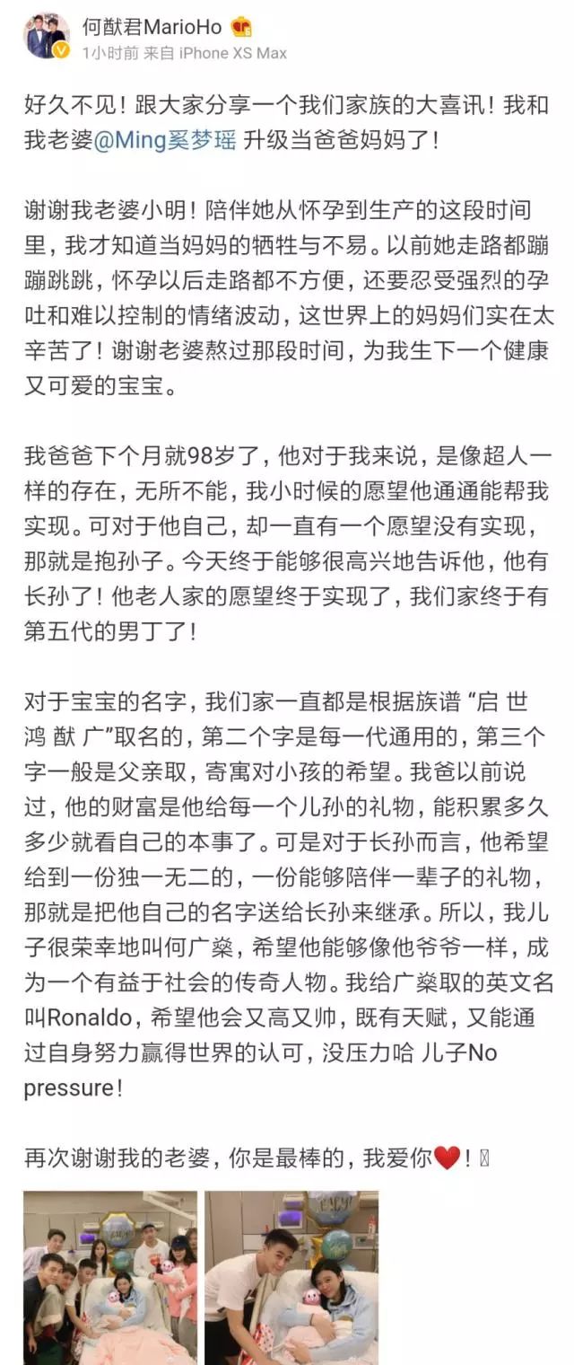 何猷君今天在微博中发表了长长的言论,对外宣布自己和老婆奚梦瑶当爸爸妈妈了,奚梦瑶不负众望给赌王何鸿燊产下了长孙,取名何广燊,对于赌王何鸿燊来说这绝对是天大的喜讯,虽然赌王何鸿燊一生风流娶了四房太太,目前有十几个子女,但是第三代里却始终没有男孩,而如今奚梦瑶产下何广燊是何鸿燊的第一个孙子,已经98岁的何鸿燊终于盼到了这一天!