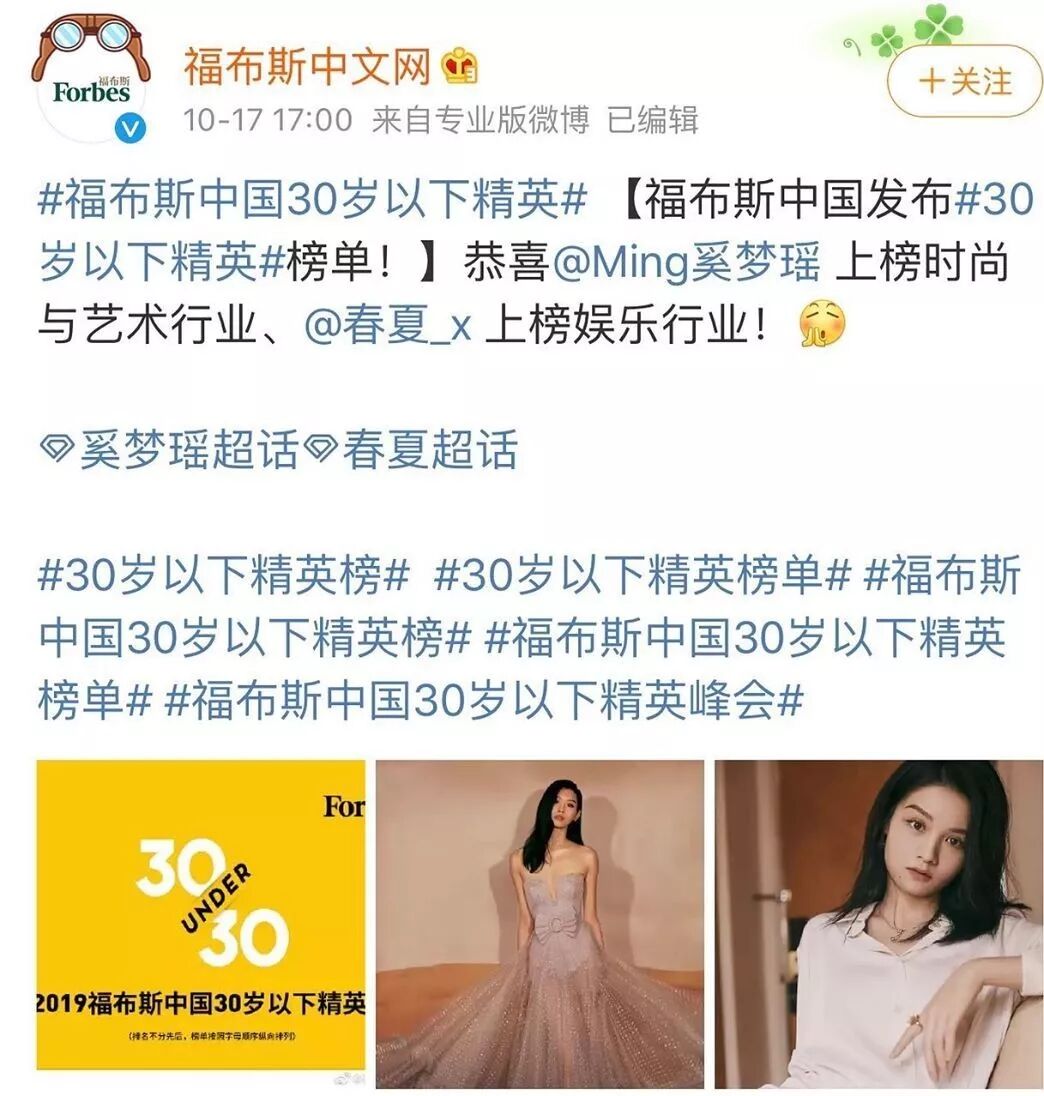 这个月,奚梦瑶又被福布斯中文网发布了中国30岁以下精英,位列时尚与艺术行业精英之列,证明了她本人事业的成功。