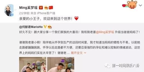10月24日下午,何猷君发文正式宣布了奚梦瑶成功生子喜讯,并公布了孩子的名字“何广燊”,英文名叫“Ronaldo”。随后奚梦瑶幸福地转发微博“亲爱的小王子,欢迎来到这个世界!”