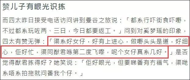 结果18年,四太突然转变了态度。在后面的采访中大赞奚梦瑶懂事、有上进心,做事头头是道非常体贴,奚梦瑶是好女孩,儿子很有眼光。