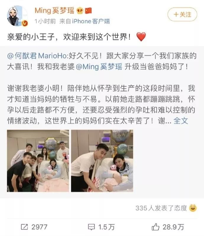 娱乐圈的习俗——生孩子先拍照发微博,即使是澳门赌王儿子何猷君也不免俗。