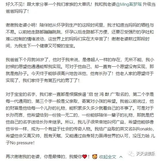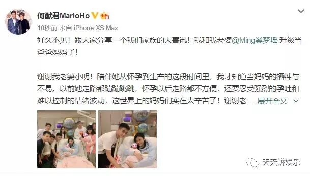 10月24日,何猷君在微博上官宣了奚梦瑶产子喜讯,并且首次晒出了奚梦瑶产后的照片。何猷君分享了奚梦瑶怀孕期间的不容易,言语中全都是对奚梦瑶的心疼,奚梦瑶这次顺利产下儿子,同时这个小宝宝也是赌王何鸿燊的长孙,第五代男丁!并且还向网友分享了给儿子取名的寓意,儿子取名“何广燊”,这也和何猷君父亲何鸿燊的名字相似,可见何猷君对这个孩子的期望。