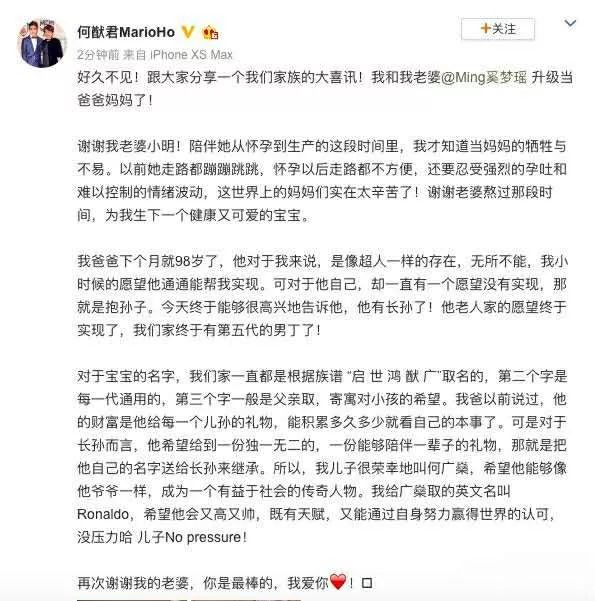 10月24日下午,何猷君发文宣布奚梦瑶生子喜讯,并公布了孩子的名字为“Ronaldo”。