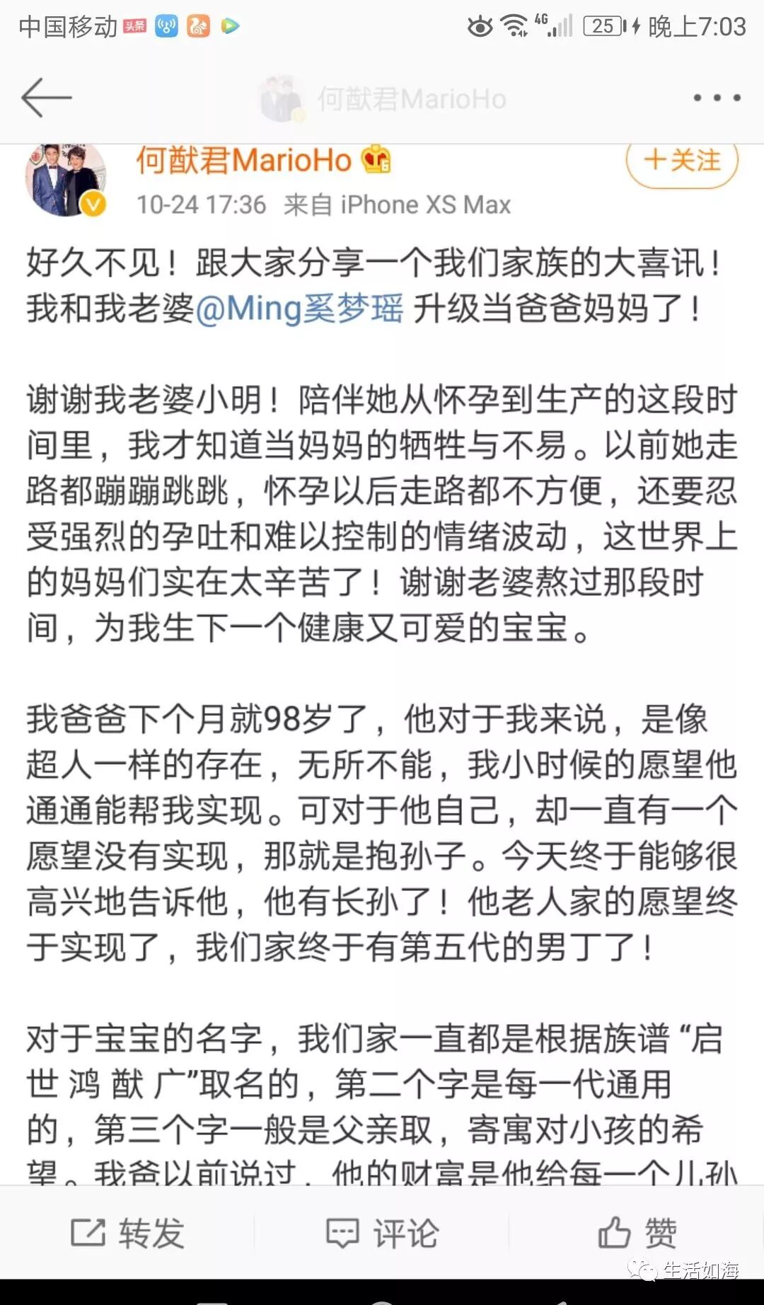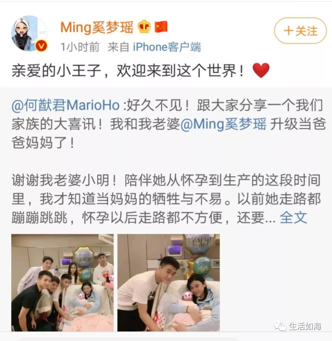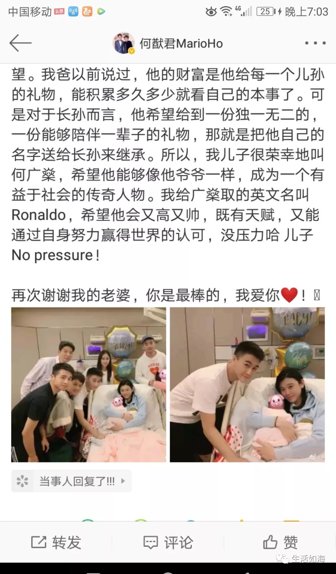 何猷君分享喜讯:奚梦瑶产子!赌王家族第五代第一个男丁,恭喜恭喜!赌王何鸿燊为长孙取名何广燊,这是把他自己名字送给了长孙啊,太宠了吧[跪了][跪了]哇!奚梦瑶生了!这是什么神仙投胎!真·含着金汤匙出生的孩子!赌王长孙,取名“何广燊”,又继承了赌王何鸿燊名字里的“燊”字,这意义不言而喻。