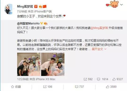 10月24日下午,四太儿子何猷君激动地发文宣布新婚妻子、超模奚梦瑶的生子喜讯,并公布了孩子的名字“何广燊”,英文名叫“Ronaldo”。