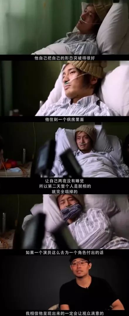 但在背后,他也付出了极大地努力,为了一段在病房里的戏,两天两夜没睡觉,住在病房里找感觉,整个人的状态十分憔悴。