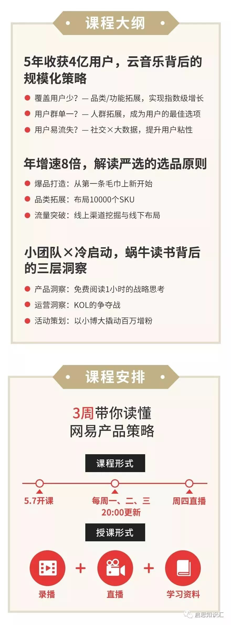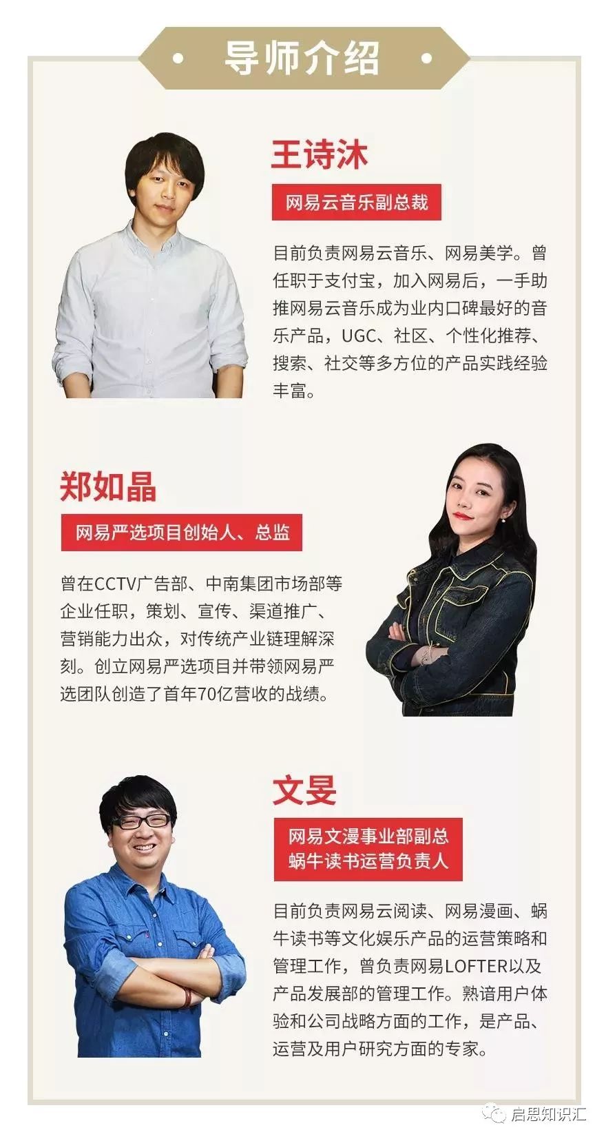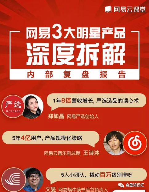 因此,为了让产品和运营的伙伴,迅速补齐短板,打造核心竞争力,邀请了网易严选、网易云音乐、网易蜗牛读书三款明星级产品操盘手,亲自完整复盘自己弯道超车的实操经验。