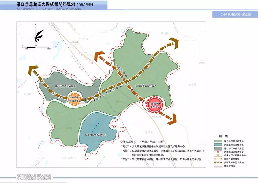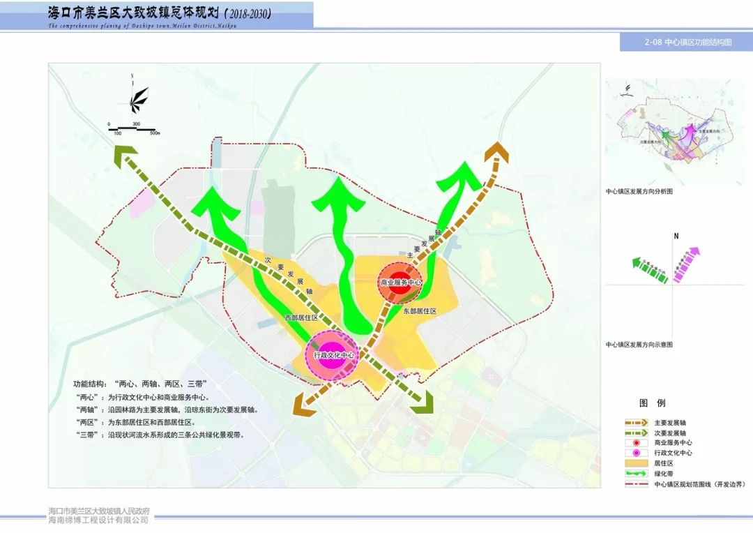 一廊:以海文高速公路和琼文公路形成的交通发展廊道。两心:为大致坡镇区综合发展中心和咸来片区综合发展中心。五区:林下经济发展区、反季节瓜菜种植区、花卉种植区、乡村旅游发展区、建材加工产业区。五、镇域土地利用规划用地分类包括城乡居民点建设用地、区域交通设施用地、区域公用设施用地、工业用地、其他建设用地、公墓用地、水域、农林用地等。六、镇域村镇体系规划根据村镇体系空间结构组织,中心镇——中心村——特色村三个等级。中心镇:大致坡中心镇区,是全镇的政治、经济、文化中心。中心村:咸来墟、大东村、咸来村、崇德村、美桐村、大榕村。其中咸来墟基础设施相对较好,经济辐射能力在大致坡镇西部片区中作用明显,是周边行政村经济、社会服务中心。其他中心村是周边各自然村的公共服务中心。特色村:金堆村、昌福村、栽群村、美良村、永群村,特色村是作为周边各自然村的公共服务同时根据村庄特色建设共享农庄、田园综合体等,发展乡村旅游。七、城镇性质大致坡镇城镇性质为:琼东北地区以商业贸易、现代服务为主,具有琼剧文化特色的中心小城镇。八、镇区功能结构根据城镇各功能要素的特点,按照管理分区,协调发展的原则,大致坡镇区的规划结构确定为“两心、两轴、两区、三带”。“两心”:以现状镇政府驻地、学校、医院、琼剧文化广场形成的行政文化中心;以北部集中商业设施形成的商业中心。“两轴”:沿园林路为主要发展轴,沿琼东街为次要发展轴。“两区”:为东西居住片区。“三带”:沿现状河流水系形成的三条公共绿化景观带。九、镇区用地布局镇区建设用地主要分为:居住用地(二类居住用地)、二类居住用地/商业用地、二类居住用地/商业用地/商务用地、公共管理与公共服务设施用地(包括行政办公用地、文化设施用地、教育科研用地、中小学用地、医疗卫生用地、社会福利用地)、商业服务业设施用地(包括商业用地、商业用地/商务用地、加油加气站用地、其他公共设施营业网点用地)、道路与交通设施用地(包括城市道路用地、交通枢纽用地、社会停车场用地)、公用设施用地(供水用地、供燃气用地、排水用地、环卫用地、消防用地、)、绿地与广场用地(公园绿地、防护绿地)等。(详见镇区用地规划图集附表)
