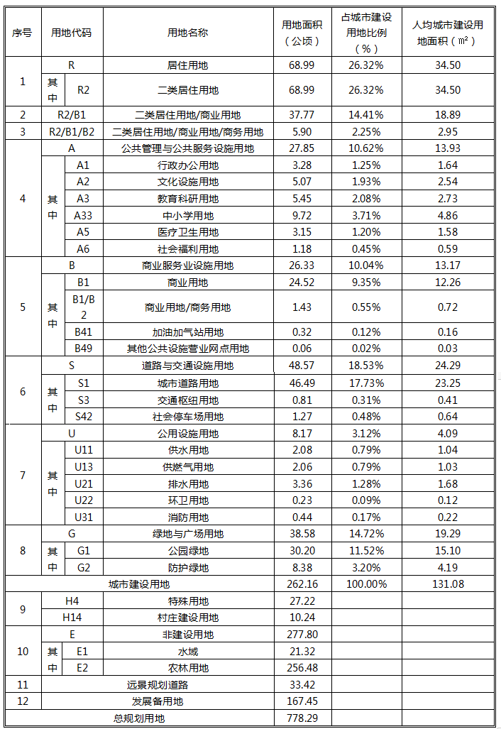 附表:中心镇区 规划建设用地平衡表(2030年)
