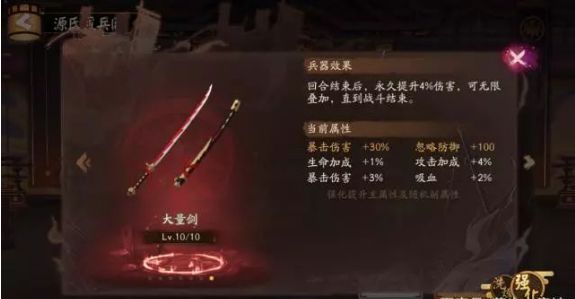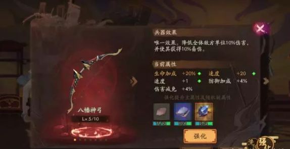 大量剑是必须强化满的,毕竟每回合+4%的伤害是非常客观的,然后就是八幡神弓和天之琼矛也尽量强化满,最后就是布都御魂这个可以留在最后一天强化,主要是用来打大岳丸BOSS用的。