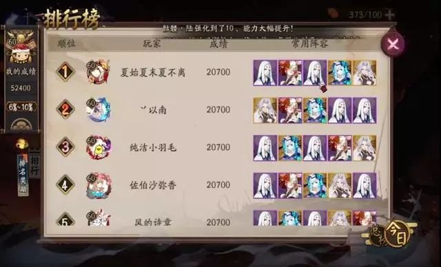 由于今天的难度又有所增加,排行榜上的阵容已经没有昨天那么多的选择,基本上都是妖琴师和泷夜叉姬、追月神的搭配。