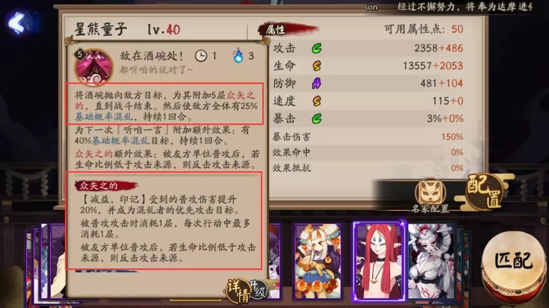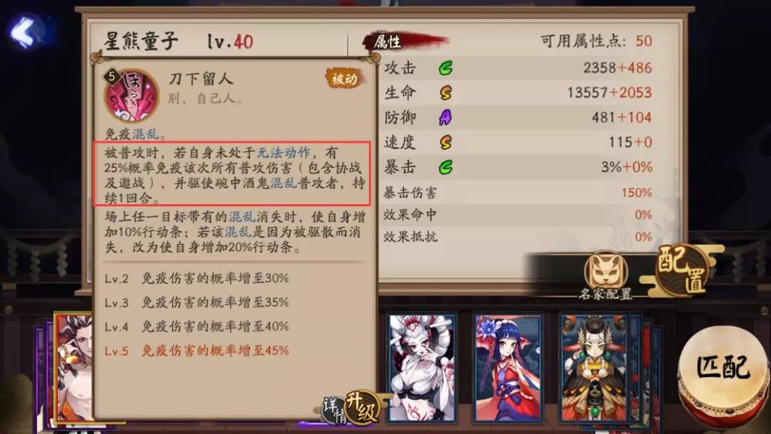 另一种打法就是二号位带速度,让SP酒吞在单拉的情况下也可以被拉起。这个带法还有一个好处就是,有的时候甚至可以不用带拉条,因为自身速度足够,阵容搭配方面可以更加灵活。
