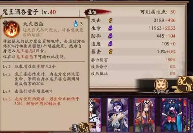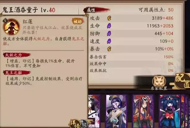 解读:这SP酒吞厉害了,天生免控制可还行,这应该是吸取了SSR酒吞的教训了,不过自身续航和恢复能力可能会比较差一些,受到治疗效果减少比较肉疼。这个大妖之力的BUFF看起来不错,和酒吞不太能吃奶完美契合,类似早年的吸血姬一样,通过空血来打极限输出,个人推测如果控血能力不错的话可以极限玩个反杀什么的,配合匣女这样的很有前途。