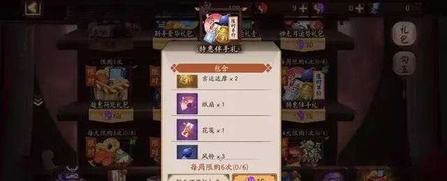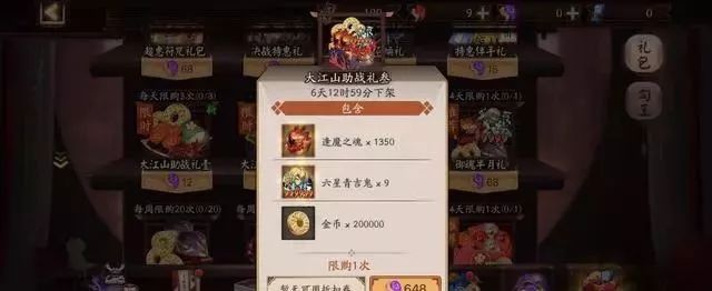 限购时间:10月23日维护后-10月29日23:59限购1次购买后连续7天每天获得:神秘的符咒×2,6星青吉鬼×1,5星青吉鬼×1,4星青吉鬼×3,金币×50000【大江山助战礼壹】