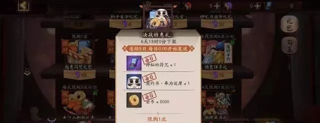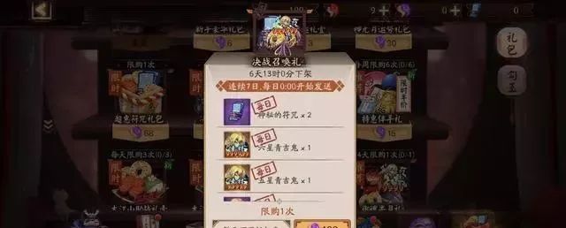 限购时间:10月23日维护后-10月29日23:59限购1次购买后连续5天每天获得:神秘的符咒×1,奉为达摩×1,金币×5000 【决战召唤礼】